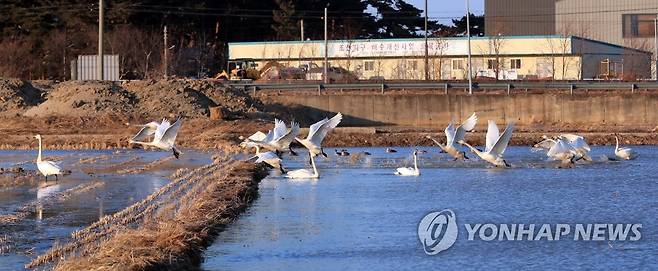 (양양=연합뉴스) 이종건 기자 = 16일 양양 남대천 인근 논에서 먹이활동을 하던 고니들이 장소 이동을 위해 날아오르고 있다.
