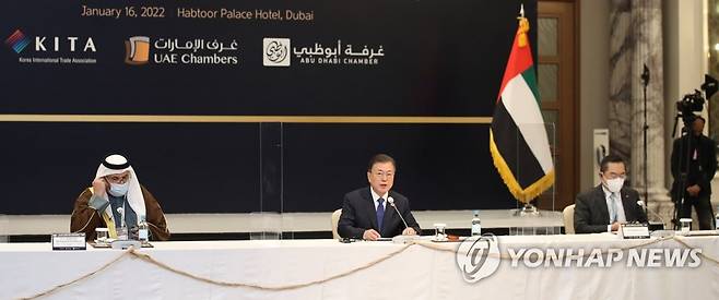 (두바이=연합뉴스) 서명곤 기자 = 문재인 대통령이 16일(현지시간) 두바이 한 호텔에서 열린 한-UAE 수소협력 비즈니스 라운드 테이블에서 발언하고 있다.