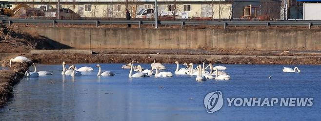 (양양=연합뉴스) 이종건 기자 = 16일 양양 남대천 인근 논에서 고니들이 먹이활동을 하고 있다.