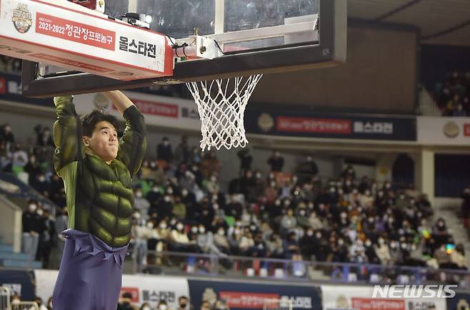[대구=뉴시스] 이무열 기자 = 하윤기(KT)가 16일 오후 대구체육관에서 열린 ‘2021~2022 KGC인삼공사 정관장 프로농구 올스타전’에서 헐크 분장을 한 채 덩크슛 콘테스트 결승전에 참가하고 있다. 2022.01.16. lmy@newsis.com