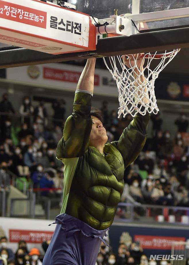 [대구=뉴시스] 이무열 기자 = 하윤기(KT)가 16일 오후 대구체육관에서 열린 ‘2021~2022 KGC인삼공사 정관장 프로농구 올스타전’에서 헐크 분장을 한 채 덩크슛 콘테스트 결승전에 참가하고 있다. 2022.01.16. lmy@newsis.com