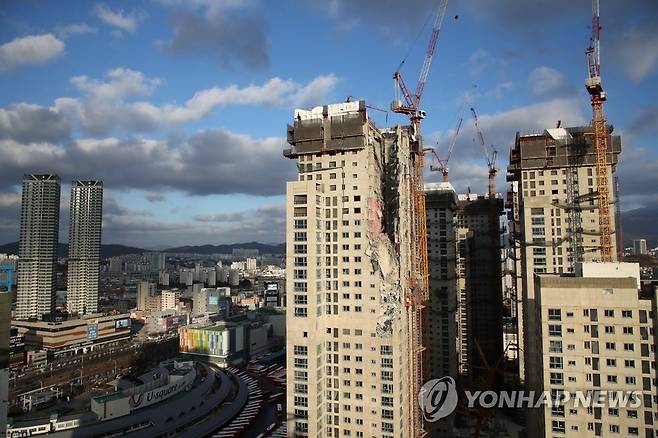 (광주=연합뉴스) 조남수 기자 = 광주 서구 화정동 신축아파트 공사 현장에서 지난 11일 오후 3시 46분께 아파트 23~38층 외벽 등 구조물이 무너져 내려 5명이 실종됐고 2명의 사상자가 나왔다. 사실은 사고 발생 엿새째인 16일 화정아이파크. 2022.1.16