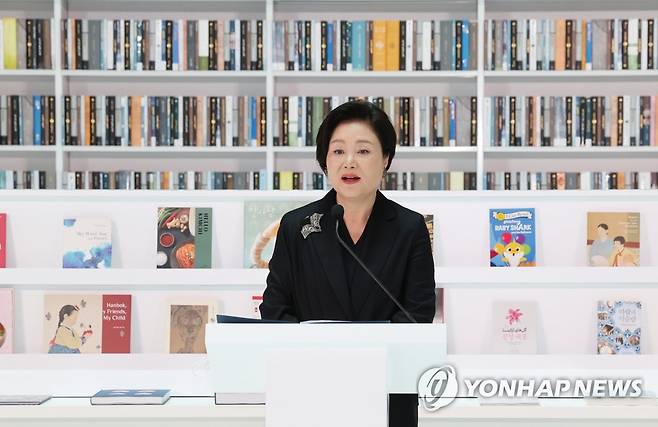 (두바이=연합뉴스) 서명곤 기자 = 김정숙 여사가 16일(현지시간) 아랍에미리트(UAE) 두바이 모하메드빈라시드(MBR) 도서관에서 열린 한-UAE 지식문화 교류식에서 축사를 하고 있다. 2022.1.16