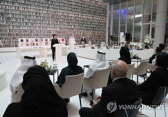(두바이=연합뉴스) 서명곤 기자 = 김정숙 여사가 16일(현지시간) 아랍에미리트(UAE) 두바이 모하메드빈라시드(MBR) 도서관에서 열린 한-UAE 지식문화 교류식에서 축사를 하고 있다. 2022.1.16
