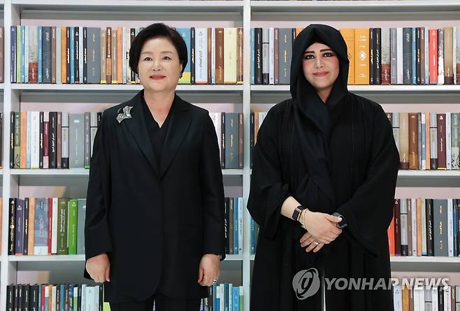 (두바이=연합뉴스) 서명곤 기자 = 김정숙 여사가 16일(현지시간) 두바이 모하메드빈라시드(MBR) 도서관에서 열린 한-UAE 지식문화 교류식을 마친 뒤 라티파 빈트 모하메드 빈 라쉬드 알막툼 공주와 기념촬영을 하고 있다. 2022.1.16