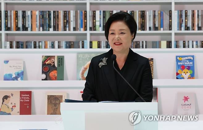 (두바이=연합뉴스) 서명곤 기자 = 김정숙 여사가 16일(현지시간) 아랍에미리트(UAE) 두바이 모하메드빈라시드(MBR) 도서관에서 열린 한-UAE 지식문화 교류식에서 축사를 하고 있다. 2022.1.16