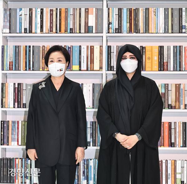 문재인 대통령과 함께 두바이를 방문 중인 김정숙 여사가 16일 오전(현지시각) 중동 최대 규모의 모하메드 빈 라시드 도서관에서 열린 ‘한-UAE 지식문화 교류식’에서 라티파 빈트 모하메드 빈 라쉬드 알 막툼 공주와 기념촬영을 하고 있다. 2022.1.16