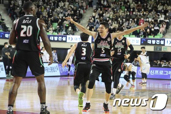 (대구=뉴스1) 공정식 기자 = 16일 오후 대구체육관에서 열린 '2021-2022 KGC인삼공사 정관장 프로농구' 올스타전 경기, 팀 허훈을 상대로 120 대 117 승리를 거둔 팀 허웅 선수들이 기뻐하고 있다. 2022.1.16/뉴스1