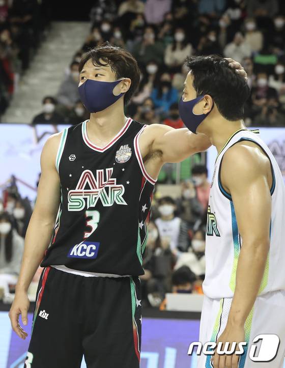 (대구=뉴스1) 공정식 기자 = 16일 오후 대구체육관에서 열린 '2021-2022 KGC인삼공사 정관장 프로농구' 올스타전 경기, 120 대 117 승리를 거둔 허웅이 동생 허훈의 머리를 쓰다듬고 있다. 2022.1.16/뉴스1