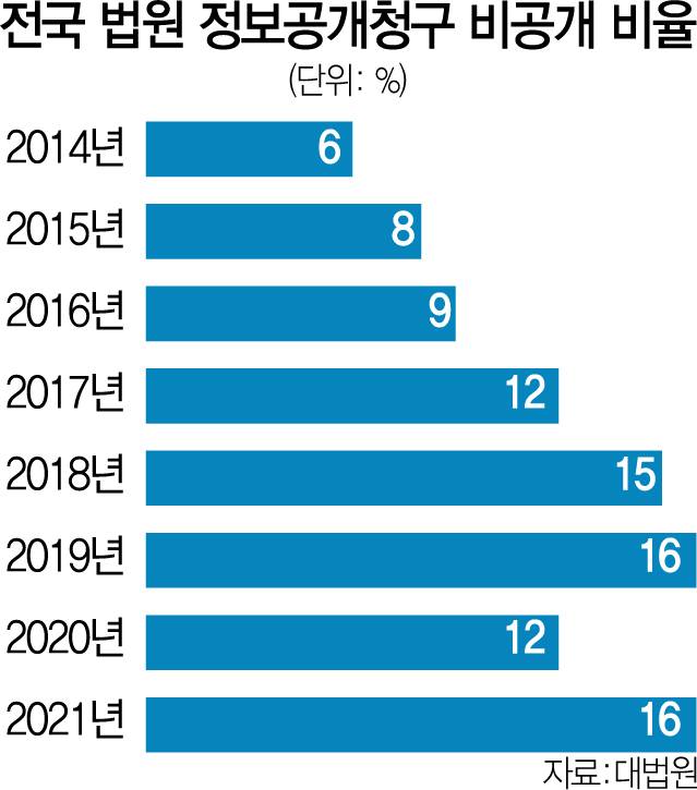 16일 대법원에 따르면 지난해 전국 법원을 상대로 제기된 정보공개청구 1,498건 가운데 242건(16%)가 비공개처리됐다. 이는 1,521건 중 99건(6%)이 비공개된 지난 2014년보다 2,48배나 증가한 수치다. 정보공개청구에 대한 사법부의 비공개 처리 비율은 2014년 이후 계속 증가하고 있다. 지난 2015년 8%에서 2016년 9%를 기록한 데 이어 2017년에는 12%로 늘었다. 2018년(15%)과 2019년(16%)에도 증가세가 이어졌다. 비공개율이 전년도보다 4%포인트 하락한 2020년(12%)을 제외하고는 꾸준히 늘었다. 다만 2020년의 경우도 다른 중앙행정기관의 평균 비공개율을 2배가량 웃돌았다. 지난해 8월 행정안전부가 발간한 ‘2021년 정보공개 연차보고서’에 따르면 지난 2020년 중앙행정기관의 평균 비공개율은 5%을 기록했다.