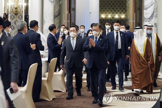 (두바이=연합뉴스) 서명곤 기자 = 문재인 대통령이 16일(현지시간) 두바이 한 호텔에서 열린 한-UAE 수소협력 비즈니스 라운드 테이블에 입장하고 있다. 2022.1.16
