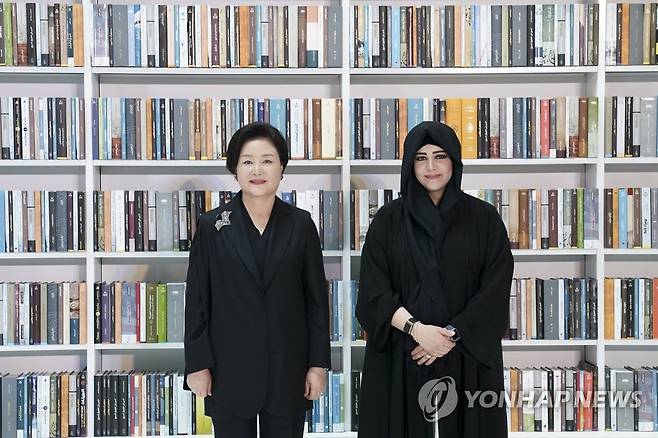 (두바이=연합뉴스) 서명곤 기자 = 김정숙 여사가 16일(현지시간) 두바이 모하메드빈라시드(MBR) 도서관에서 열린 한-UAE 지식문화 교류식을 마친 뒤 두바이 문화예술위원회 위원장인 라티파 빈트 모하메드 빈 라쉬드 알막툼 공주와 기념촬영을 하고 있다. 2022.1.16