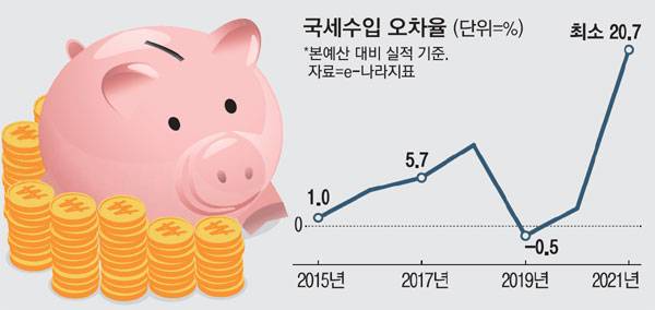 지난해 1~11월 국세 수입은 323조4000억원으로 정부가 작년 본예산을 짤 때 전망한 연간 전체 수입액 282조7000억원보다 40조7000억원이나 많다. 작년 12월에 전년 동월(17조7000억원)만큼만 걷힌다고 가정해도 초과 세수는 58조4000억원이다. 기재부는 작년 12월 세수가 전년 동월 대비 소폭 증가했을 것으로 본다. 연간 초과 세수는 60조원, 본예산 대비 오차율은 최소 20.7%에 이르는 셈이다. 확인 가능한 1990년 이후 역대 최악이다.