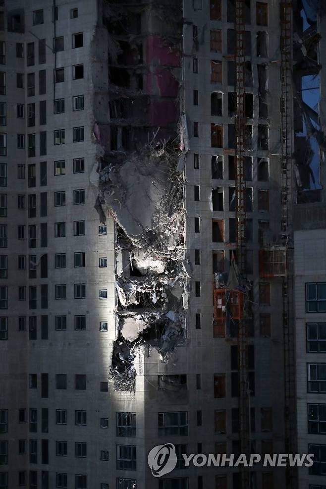 (광주=연합뉴스) 조남수 기자 = 광주 서구 신축아파트 붕괴사고 발생 엿새째인 16일 사고 현장인 화정아이파크에 어둠이 깔리고 있다. 2022.1.16