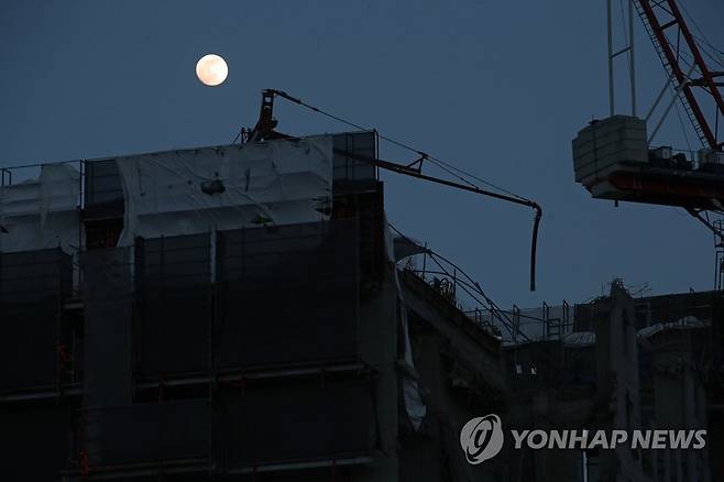 (광주=연합뉴스) 조남수 기자 = 광주 서구 신축아파트 붕괴사고 발생 엿새째인 16일 사고 현장인 화정아이파크 201동 너머로 달이 떠오르고 있다. 2022.1.16