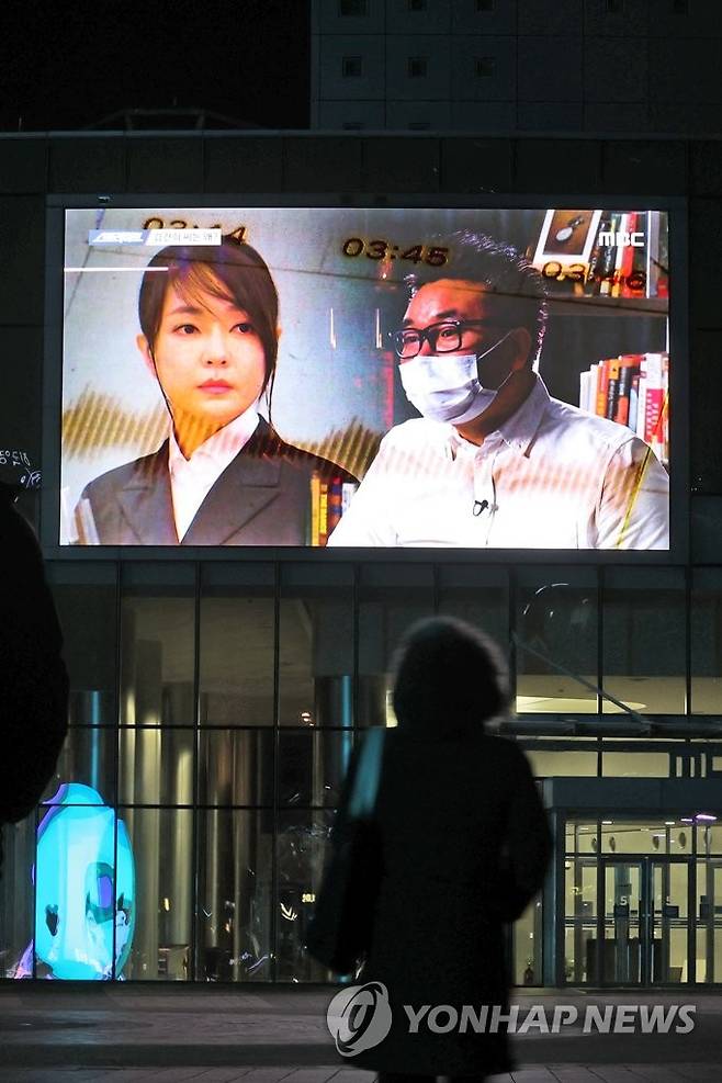 (서울=연합뉴스) 임화영 기자 = 16일 오후 서울 상암동 MBC 사옥에 걸린 전광판에서 국민의힘 윤석열 대선 후보의 배우자 김건희 씨의 '7시간 전화 통화' 내용을 다루는 MBC 프로그램 '스트레이트'가 방영되고 있다. 2022.1.16