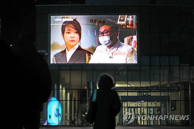 (서울=연합뉴스) 임화영 기자 = 16일 오후 서울 상암동 MBC 사옥에 걸린 전광판에서 국민의힘 윤석열 대선 후보의 배우자 김건희 씨의 '7시간 전화 통화' 내용을 다루는 MBC 프로그램 '스트레이트'가 방영되고 있다. 2022.1.16