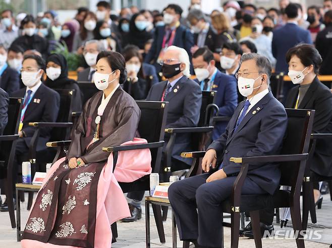 [두바이=뉴시스] 김진아 기자 = 문재인 대통령과 김정숙 여사가 16일(현지시간) 아랍에미리트 두바이 엑스포 알 와슬 플라자에서 열린 두바이 엑스포 한국의 날 공식행사에서 나흐얀 빈 무바락 관용공존부장관의 연설을 듣고 있다. 2022.01.16. bluesoda@newsis.com