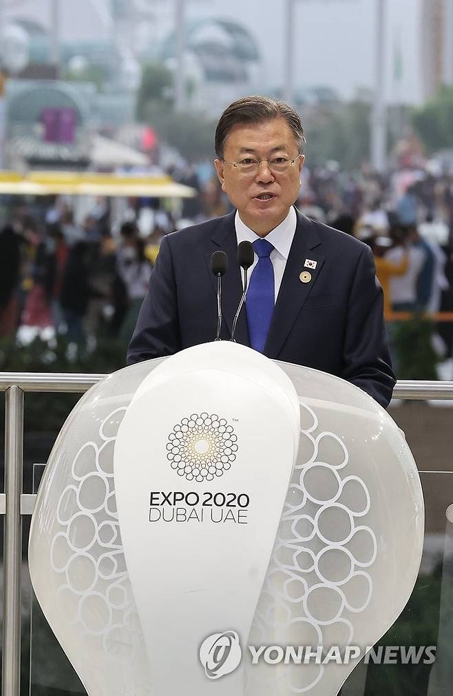 (두바이=연합뉴스) 서명곤 기자 = 문재인 대통령이 16일(현지시간) 두바이 엑스포 알 와슬 플라자에서 열린 두바이 엑스포 한국의 날 공식행사에서 연설하고 있다. 2022.1.16