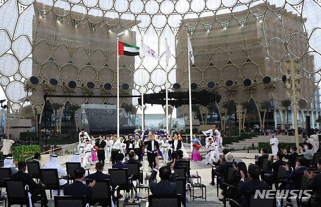 [두바이=뉴시스] 김진아 기자 = 문재인 대통령과 김정숙 여사가 16일(현지시간) 아랍에미리트 두바이 엑스포 알 와슬 플라자에서 열린 두바이 엑스포 한국의 날 공식행사에서 문화공연을 보고 있다. 2022.01.16. bluesoda@newsis.com