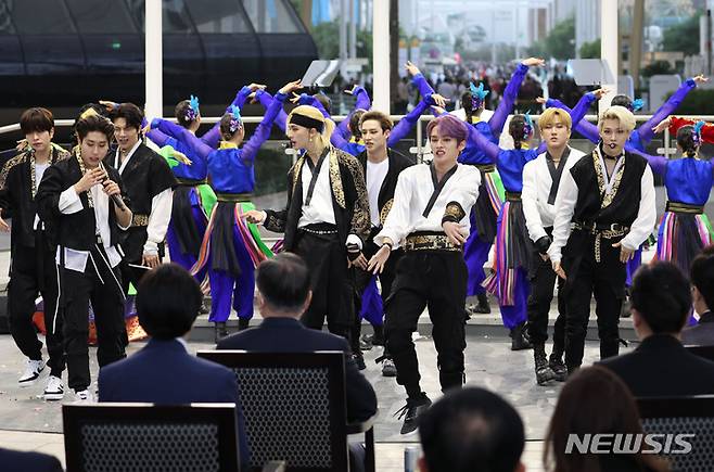 [두바이=뉴시스] 김진아 기자 = 문재인 대통령과 김정숙 여사가 참석한 가운데 16일(현지시간) 아랍에미리트 두바이 엑스포 알 와슬 플라자에서 열린 두바이 엑스포 한국의 날 공식행사에서 그룹 스트레이 키즈가 공연을 하고 있다. 2022.01.16. bluesoda@newsis.com