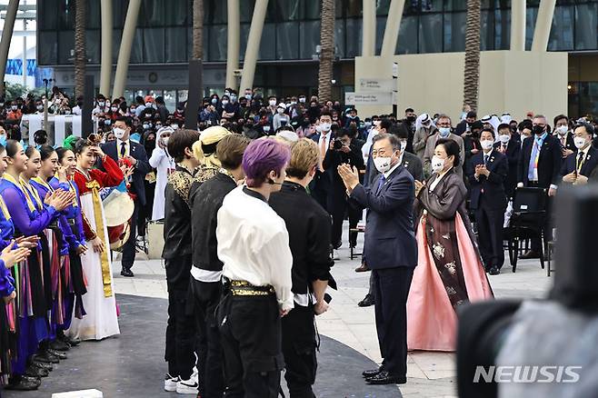 [두바이=뉴시스] 김진아 기자 = 문재인 대통령과 김정숙 여사가 16일(현지시간) 아랍에미리트 두바이 엑스포 알 와슬 플라자에서 열린 두바이 엑스포 한국의 날 공식행사에서 문화공연을 관람한 뒤 박수를 보내고 있다. 2022.01.16. bluesoda@newsis.com