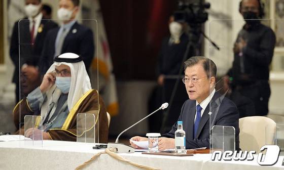 (서울=뉴스1) = 문재인 대통령이 16일(현지시간) 아랍에미리트(UAE) 두바이의 한 호텔에서 열린 한-UAE 수소협력 비즈니스 라운드 테이블에서 발언하고 있다.(청와대 제공) 2022.1.16/뉴스1