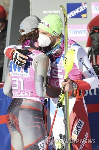 Norway's Lucas Braathen, left, the winner, embraces runner-up Norway's Lucas Braathen at the finish area of an alpine ski, men's World Cup slalom race, in Wengen, Switzerland, Sunday, Jan. 16, 2022. (AP Photo/Luciano Bisi)