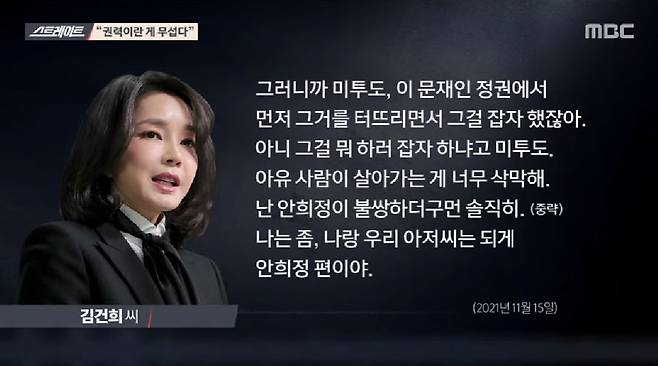 | ▲ MBC 시사프로그램 <스트레이트>가 16일 방송한 윤석열 국민의힘 대선후보의 부인 김건희씨와 <서울의소리> 이명수 기자와의 통화 내용. |