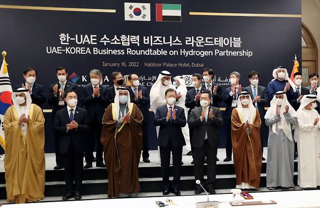 중동 3개국 순방에 나선 문재인 대통령이 16일(현지시간) 아랍에미리트연합(UAE) 두바이에서 열린 ‘한-UAE 수소 협력 비즈니스 라운드테이블’ 행사에서 기념촬영을 하고 있다.