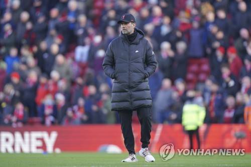 Liverpool's manager Jurgen Klopp walks on the pitch before the start of an English Premier League soccer match between Liverpool and Brentford at Anfield in Liverpool, England, Sunday, Jan. 16, 2022. (AP Photo/Jon Super)