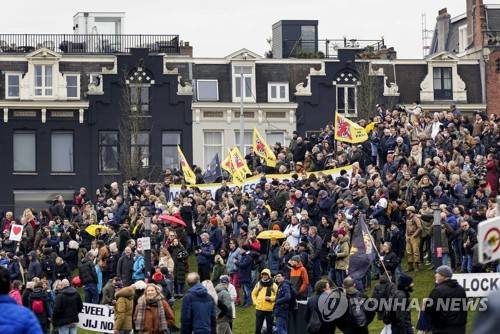 epa09689266 Protesters on the Museumplein during 'the commemoration of the coffee battle' action organized by the Dutch activist group called 'Netherlands in Resistance' (Nederland in Verzet) in Amsterdam, the Netherlands, 16 January 2022. The action group protested against the government's COVID-19 policy. With the 'commemoration of the Coffee Battle', the organization wants to look back at the past year when, because of a ban on demonstrations, they decided to 'drink coffee' as a form of protest. EPA/PHIL NIJHUIS