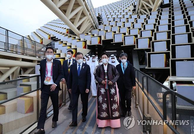 (두바이=연합뉴스) 서명곤 기자 = 문재인 대통령과 김정숙 여사가 16일(현지시간) 두바이 엑스포 한국관을 둘러보고 있다. 2022.1.16