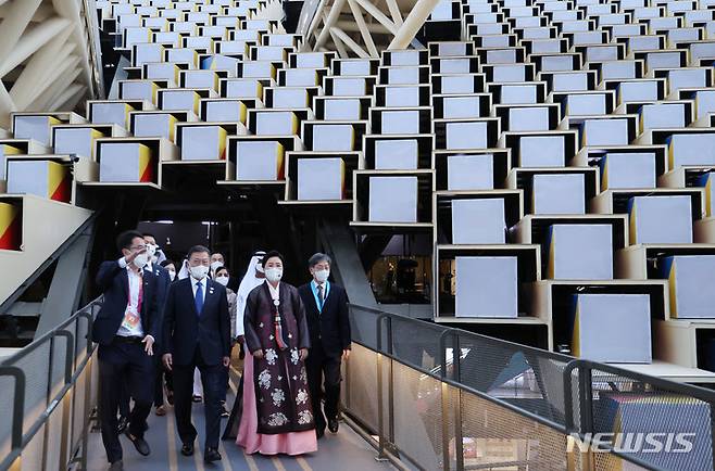 [두바이=뉴시스] 김진아 기자 = 문재인 대통령과 김정숙 여사가 16일(현지시간) 아랍에미리트 두바이 엑스포 한국관을 참관하고 있다. 2022.01.16. bluesoda@newsis.com