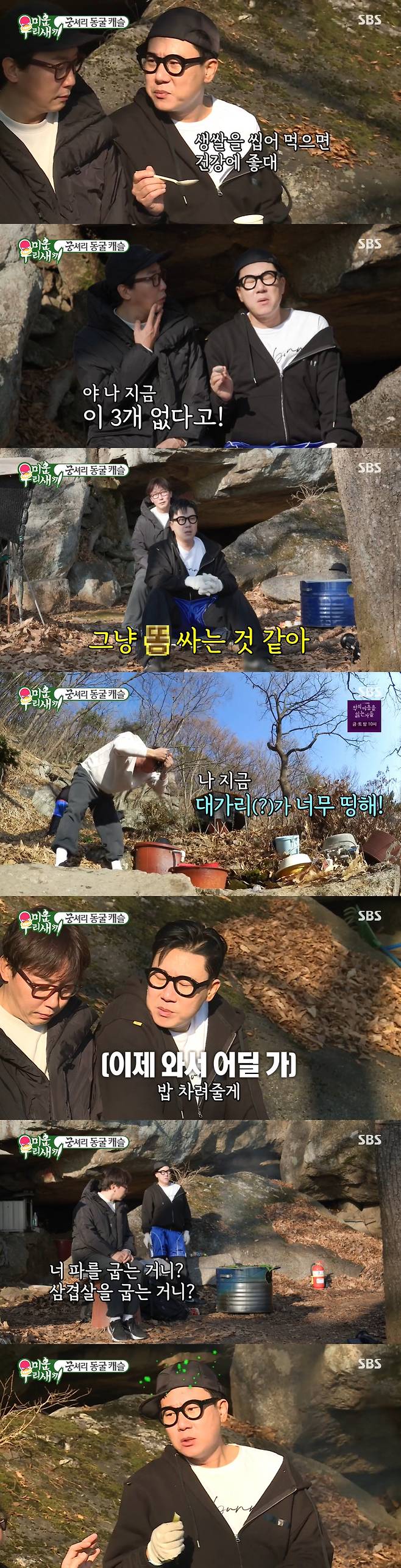 이상민은 탁재훈을 데리고 산속 동굴로 향했다. 목적지도 모른 채 따라온 탁재훈은 '동굴 숙소'라는 말에 "지금 실화냐"며 당황했다.
