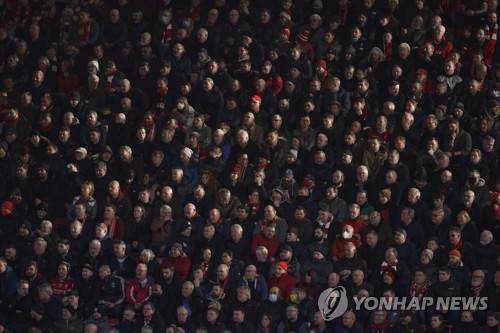 Liverpool supporters wait for the start of an English Premier League soccer match between Liverpool and Brentford at Anfield in Liverpool, England, Sunday, Jan. 16, 2022. (AP Photo/Jon Super)
