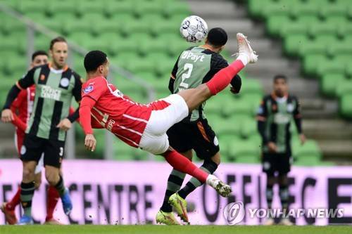 epa09689287 (L-R) - Cody Gakpo of PSV Eindhoven and Damil Dankerlui Wadilie of FC Groningen in action during the Dutch Eredivisie soccer match between FC Groningen and PSV at the Euroborg Stadium in Groningen, Netherlands, 16 January 2022. EPA/OLAF KRAAK