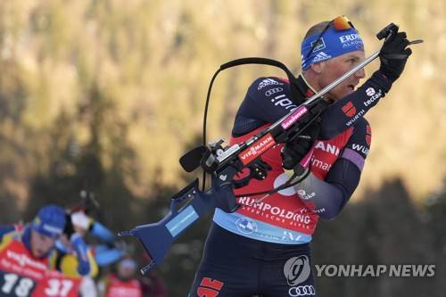 Erik Lesser of Germany competes during the men's 12.5 km pursuit race at the biathlon World Cup in Ruhpolding, Germany, Sunday, Jan. 16, 2022. (AP Photo/Matthias Schrader)