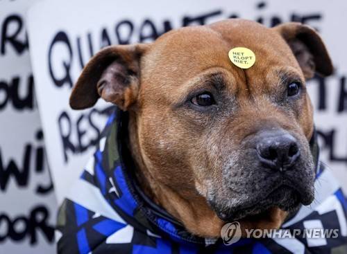epa09689308 A demonstrator's dog with a sticker on the head reading 'it's not right' is seen on the Museumplein during 'the commemoration of the coffee battle' action organized by the Dutch activist group called 'Netherlands in Resistance' (Nederland in Verzet) in Amsterdam, the Netherlands, 16 January 2022. The action group protested against the government's COVID-19 policy. With the 'commemoration of the Coffee Battle', the organization wants to look back at the past year when, because of a ban on demonstrations, they decided to 'drink coffee' as a form of protest. EPA/PHIL NIJHUIS