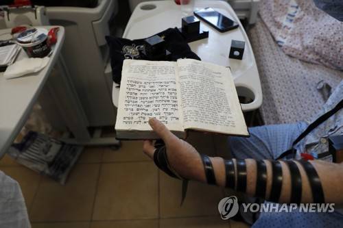 epa09689316 An Ultra-Orthodox patient performs prayer at the ICU's Covid-19 department at Ziv Hospital, in Zefat, Israel, 16 January 2022. According to Israeli health and educations ministry, the national coronavirus reproduction number continues to rise. About 7.2 percent of all students and staff are verified and isolatet, at least one case of Covid occurs in 40 percent of the school classes. EPA/ATEF SAFADI