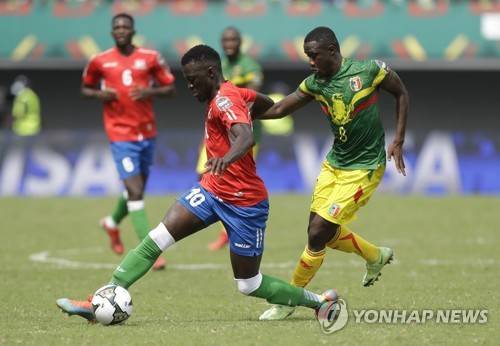 Gambia's Musa Barrow, left, controls the ball away from Mali's Diadie Samassekou, during the African Cup of Nations 2022 group F soccer match between Gambia and Mali at Omnisport Stadium in Limbe, Cameroon, Sunday, Jan. 16, 2022. (AP Photo/Sunday Alamba)