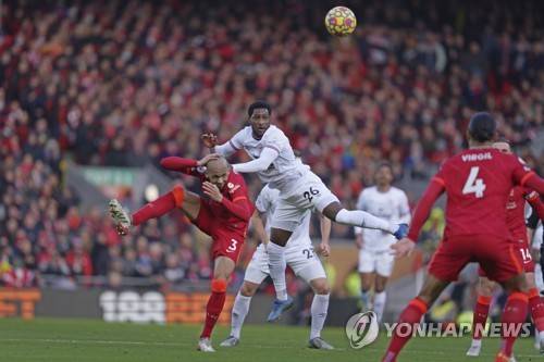 Brentford's Shandon Baptiste, centre, jumps above Liverpool's Fabinho, left, during an English Premier League soccer match between Liverpool and Brentford at Anfield in Liverpool, England, Sunday, Jan. 16, 2022. (AP Photo/Jon Super)