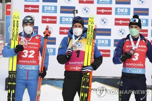 Winner Quentin Fillon Maillet of France, center, second placed Russia's Alexander Loginov, left, and third placed Anton Smolski of Belarus pose for a photo after the men's 12.5 km pursuit race at the biathlon World Cup in Ruhpolding, Germany, Sunday, Jan. 16, 2022. (AP Photo/Matthias Schrader)