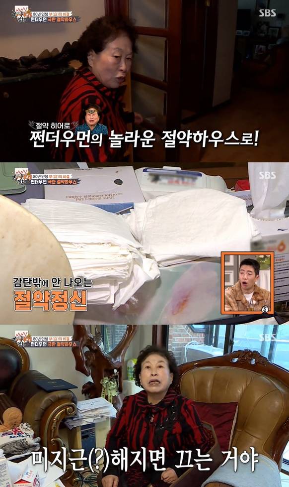 이어 전원주는 극한 절약하우스를 공개했다. 전원주는 "(자개 장롱은) 시집 올 때 갖고 온 거 그대로 쓴다. 휴지도 개업 선물로 주는 거다. 반 잘라서 쓴다. 만이 쓸까봐 낱장으로 빼놓는다. 2번 쓰고 3번 쓴다"고 설명했다.
