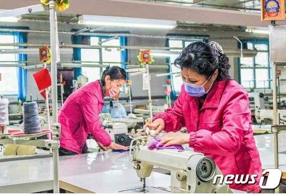 (평양 노동신문=뉴스1) = 북한 노동당 기관지 노동신문은 17일 "전 국가적, 전 사회적으로 방역 진지를 더욱 철통 같이 하자"라고 독려했다. 사진은 소독 작업 중인 동대원은하피복공장.