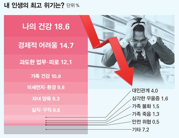 지난해 말 대한의학회지(JKMS)에 건강 경영 전략이 건강에 도움이 된다는 내용의 논문이 게재됐다. 이 연구의 기초 자료를 위해 윤영호 서울대병원 가정의학과 교수(한국건강학회 이사장)와 심진아 한림대 인공지능융합학부 교수는 전국 1000명을 대상으로 인생 위기가 무엇인지를 묻는 설문조사부터 시작했다. 그 결과, 인생 위기 1위는 '나의 건강'(18.6%)으로 나타났다. '경제적 어려움'과 '과도한 업무·피로' 등이 그 뒤를 이었다. 2018년에는 인생 위기 1위가 '미세먼지 등 환경'(18.9%)이었다. 이번 조사에서 '나의 건강'이 1위로 올라온 것은 약 2년 동안 코로나19 팬데믹을 경험하면서 건강 문제를 중요하게 여기기 때문이라는 것이 연구팀의 설명이다.