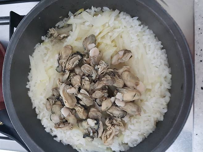 | ▲ 무 굴밥 썰을 불려 채 썰어 놓은 무를 넣고 밥을 짓는다. 뜸을 들일 때 굴을 넣는다. |