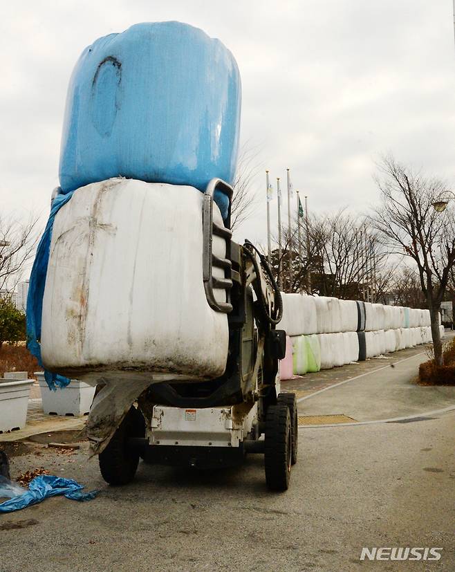 [전주=뉴시스] 김얼 기자 = 17일 전북 전주시 전북도청 앞에서 관계자들이 농민단체가 적재한 곤포 사일리지를 옮기고 있다. 2022.01.17. pmkeul@nwsis.com