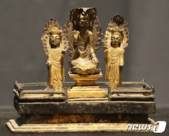 사진은 17일 오전 서울 강남구 신사동 케이옥션 사옥 내 전시 중인 국보 금동삼존불감.