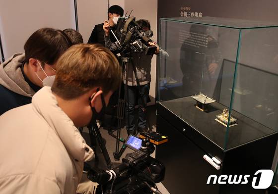 사진은 17일 오전 서울 강남구 신사동 케이옥션 사옥 내 전시 중인 국보 금동삼존불감을 촬영하는 영상기자들 . 2022.1.17/뉴스1